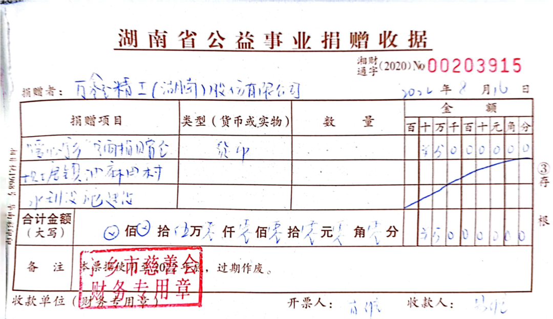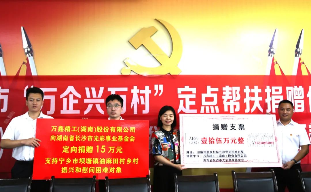 2022年7月,萬鑫向湖南省長沙市光彩事業基金會分兩次捐贈共計20萬元,用于定向幫扶寧鄉市壩塘鎮油麻田村鄉村振興、慰問困難對象和水利建設去年全年,萬鑫精工已通過各種渠道和形式,累計向社會捐助善款和物資總價值達117萬元,以實際行動,發揮民企力量參與到寧鄉鄉村建設中。